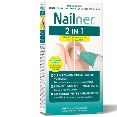 • 4. Die Füsse während mehreren Stunden nach der Anwendung nicht waschen. Nailner® 2 in 1 kann auch prophylaktisch angewendet werden. Zur Verhinderung von Nagelpilzinfektionen müssen die gefährdeten Nägel mindestens einmal täglich mit Nailner® 2 in 1 behandelt werden. Als besonderer Zusatz enthält Nailner® 2 in 1 einen Aufheller gegen Verfärbungen, welche bei einem infizierten Nagel entstehen können. Dieser Zusatz ermöglicht sichtbare Resultate bereits nach 7 Tagen.